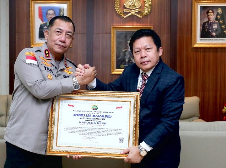 MEDIAALIF.COM,Batam – Kapolda Kepri Irjen. Pol. Drs. Yan Fitri Halimansyah menerima penganugerahan Presisi Award dari Lembaga Kajian Strategis Kepolisian Indonesia yang diberikan oleh Direktur Eksekutif (Lemkapi) Dr. Drs Edi Saputra Hasibuan.