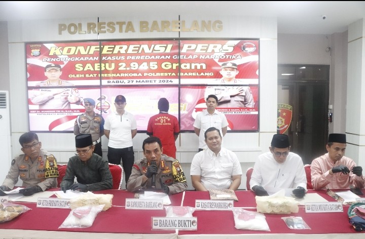 MEDIAALIF.COM,Batam – Kapolresta Barelang Kombes Pol Dr. Nugroho Tri N, SIK, MH gelar konferensi pers tersangka peredaran gelap narkotika jenis sabu seberat 2.945 gram, di lobby Mapolresta, Rabu (27/3/2024).