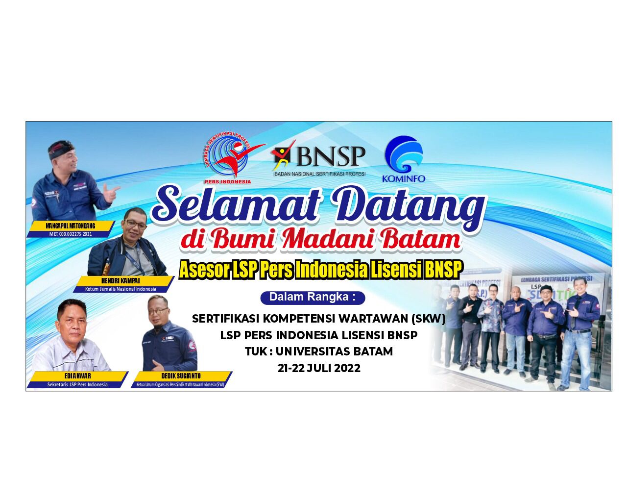 5 orang asesor yang akan ditugaskan dalam pelaksanaan SKW di Batam ini merupakan Asesor bersertifikat Badan Nasional Sertifikasi Profesi -BNSP. Kelima asesor masing-masing, Mangapul Matondang, Hendri Kampai, Edy Anwar, Dedik Sugianto, dan Hence Mandagi.