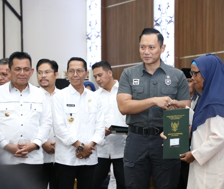 Dokumen SHM (Sertifikat Hak Milik) diberikan langsung oleh Menko Bidang Infrastruktur dan Pembangunan Kewilayahan RI, Agus Harimurti Yudhoyono atau AHY kepada warga yang telah menempati rumah barunya di Tg Banon, bertempat di gedung Bida BP Batam, Selasa (18/3/2025).
