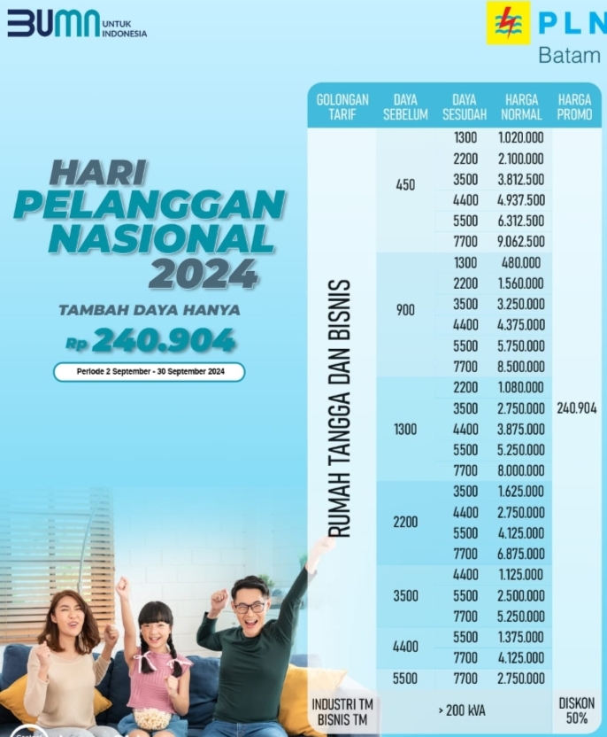 MEDIAALIF.COM, Batam – Dalam rangka memeriahkan Hari Pelanggan Nasional (HPN) 2024, PT PLN Batam beri diskon spesial tambah daya dengan harga Rp 240.904,- mulai tanggal 2 s/d 30 September 2024.