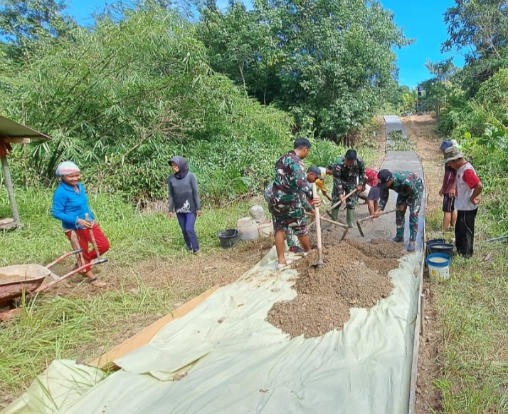 Meskipun pengecoran jalan kampung sepanjang ratusan meter dilakukan secara manual, namun tidak mengendorkan semangat sang Prajurit yang berjibaku mencintai dan menyatu dengan rakyat, bahkan kaum emak-emak pun turut andil demi perbaikan jalan di kampungnya.