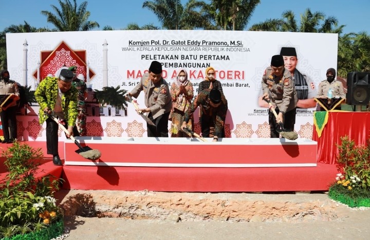 Pekanbaru-Riau,MEDIAALIF.COM – Wakapolri Komjen Gatot Eddy Pramono melakukan peletakan batu pertama pembangunan Masjid Al Kastoeri, Jalan Sri Sejahtera Kelurahan Agrowisata Kecamatan Rumbai Barat, Kota Pekanbaru Riau, Selasa (28/6/2022).
